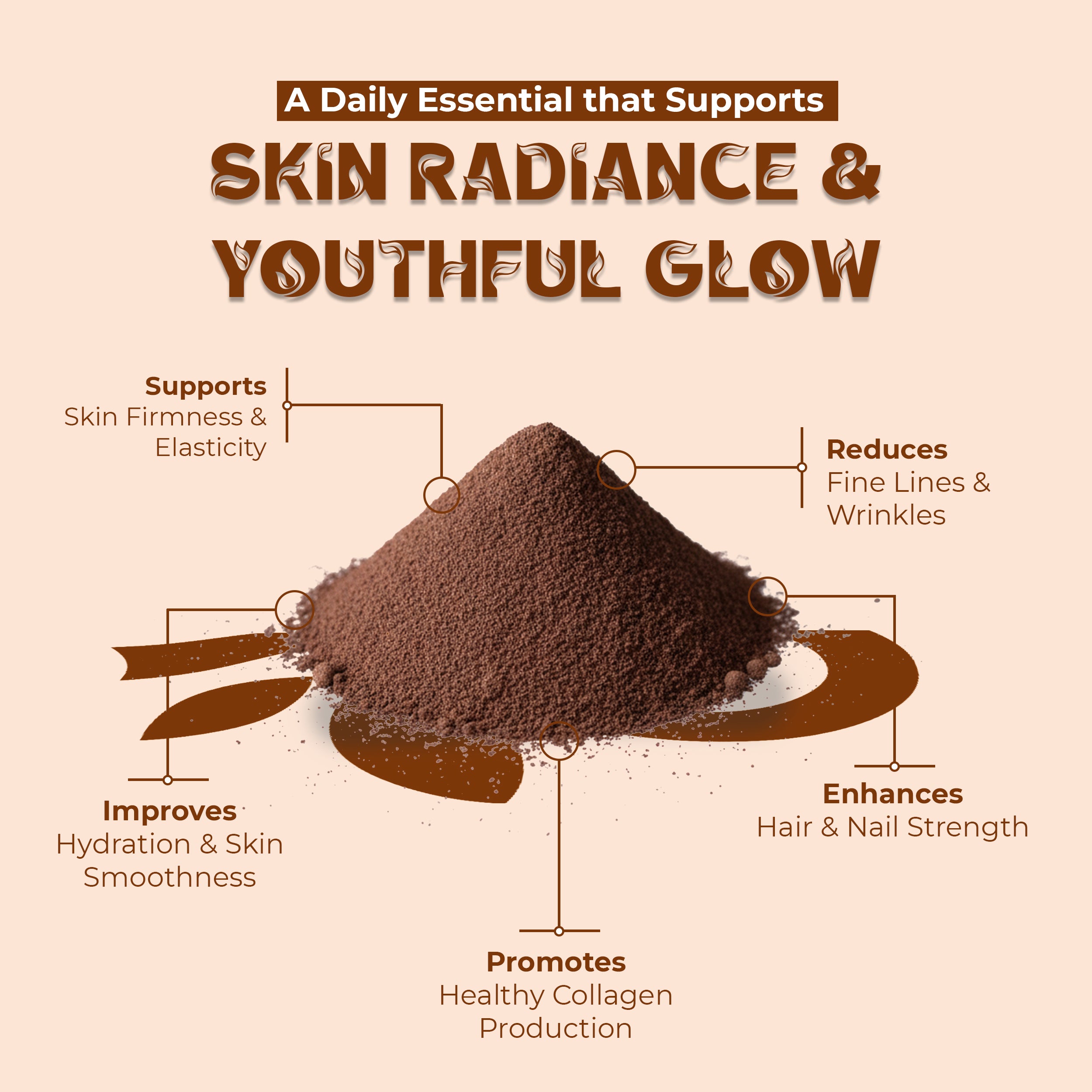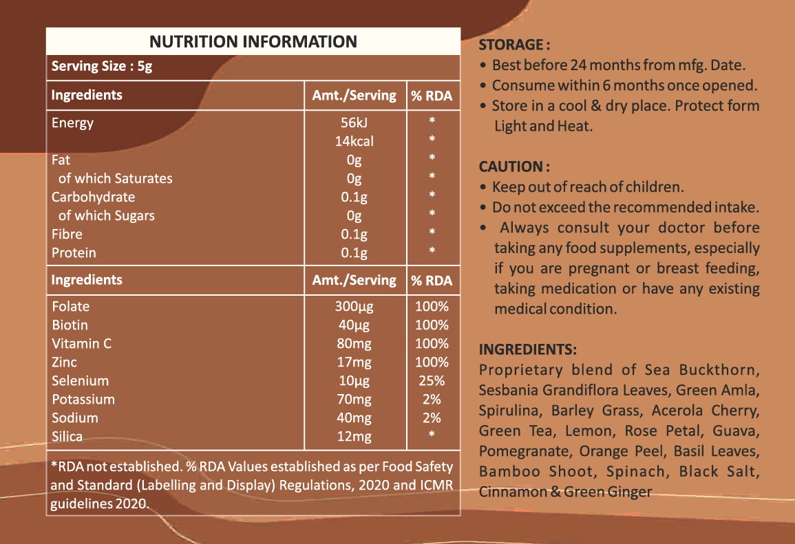 Collagen Boosters: Sea Buckthorn, Sesbania Grandiflora, Green Amla, and Bamboo Shoot (Silica).