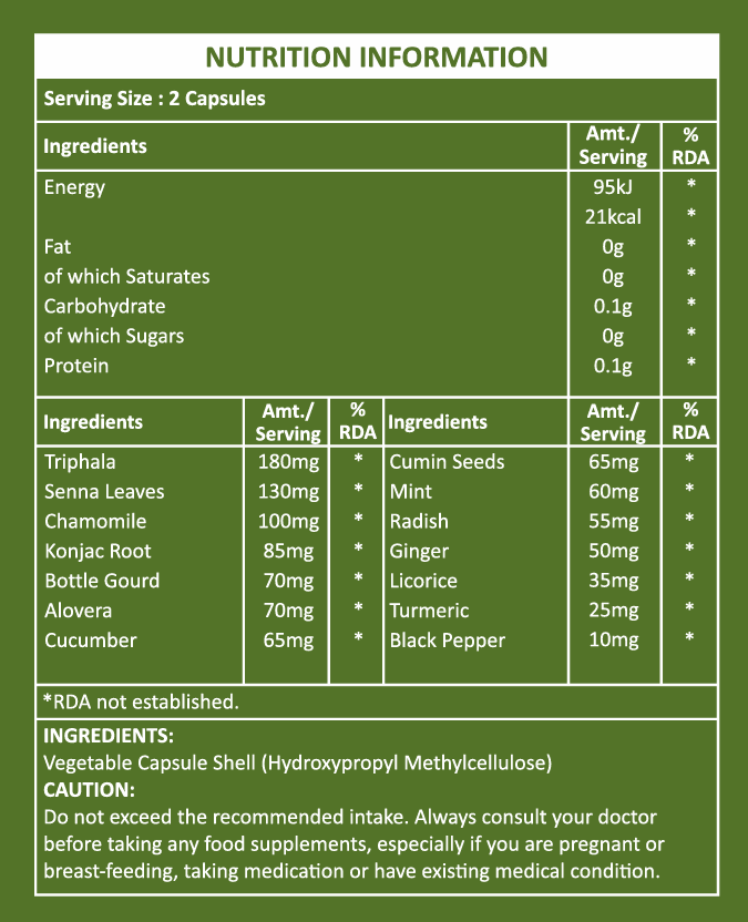 Ginger, Fennel, Peppermint, Psyllium, Barley Grass, Spirulina, Herbal Wholefood Blend