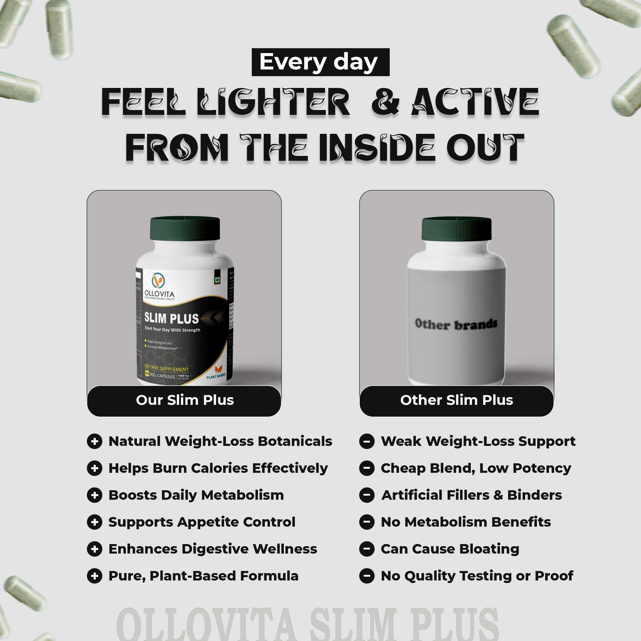 OLLOVITA Slim Plus is your plant-powered partner in achieving sustainable weight management. Our natural formula is designed to work in synergy with your body, focusing on three key areas: boosting metabolism, managing appetite, and sustaining natural energy—without the jitters or harsh side effects of chemical fat burners.